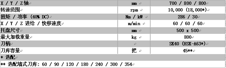 •大功率高速主軸驅(qū)動: SK40 (HSK-A63) 型電主軸轉(zhuǎn)速為 10,000 rpm、扭矩286 Nm (40% DC),或轉(zhuǎn)速 18,000 rpm、扭矩 121 Nm (40% DC) (選配)